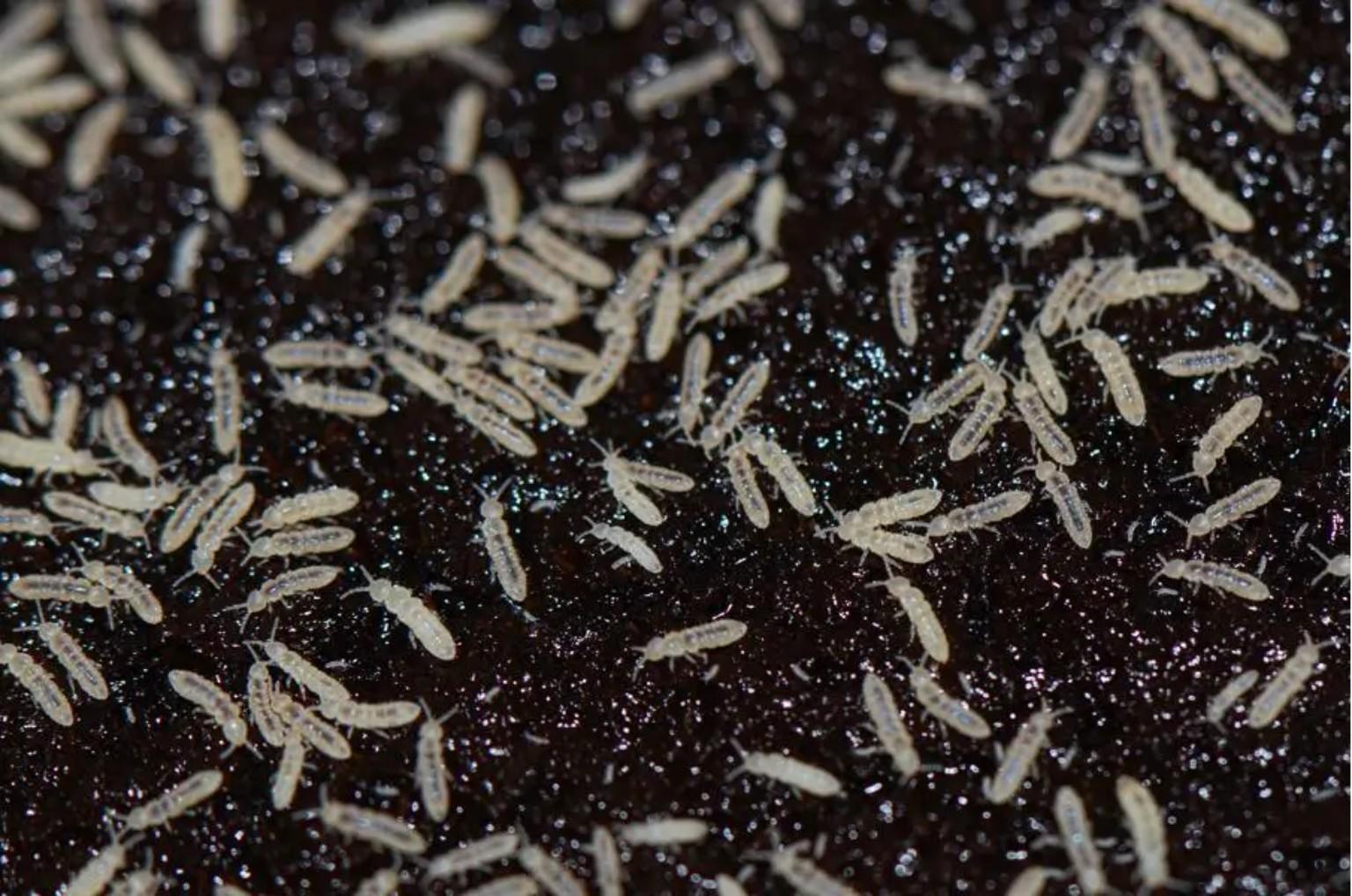 Os colêmbolos são pequenos animais do solo, geralmente brancos e quase invisíveis a olho nu. Vivem em locais úmidos, como a terra onde também ficam as minhocas, e se alimentam de fungos e matéria orgânica em decomposição. Não fazem mal às pessoas, às plantas nem aos animais, pelo contrário, ajudam a manter o solo saudável. Quando o chão é mexido, muitos colêmbolos pulam rapidamente, o que facilita identificá-los. A presença deles costuma indicar um ambiente natural e equilibrado.