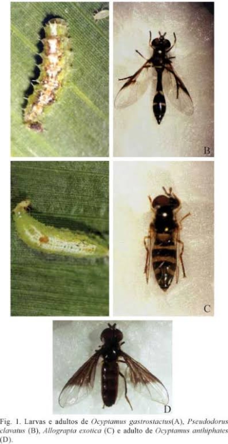 Os sírfideos são insetos conhecidos por imitar abelhas e vespas, mas na verdade são moscas inofensivas. Os adultos costumam ser vistos em flores, onde se alimentam de néctar e ajudam na polinização. Já as larvas vivem em plantas e jardins e são muito importantes, pois se alimentam de pulgões e outras pragas. Apesar da aparência que engana, os sírfideos não picam e são grandes aliados do equilíbrio natural, sendo comuns em hortas e áreas verdes.